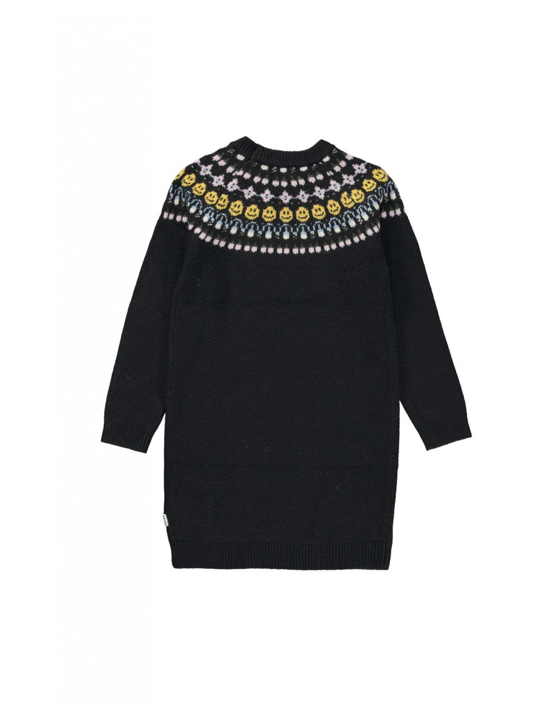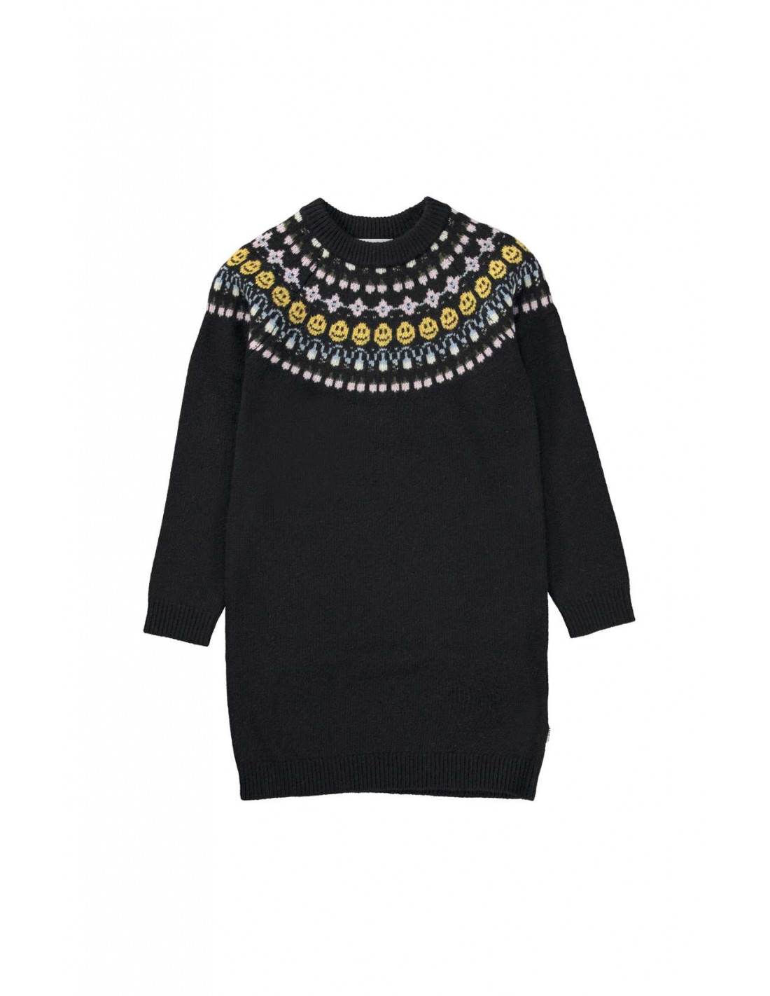 Vestido de punto negro con un motivo de inspiración nórdica en el canesú. Este vestido de punto está confeccionado en una suave mezcla de lana que lo hace perfecto para los días más fríos. Tiene cuello redondo de canalé, mangas largas de canalé y un corte recto.